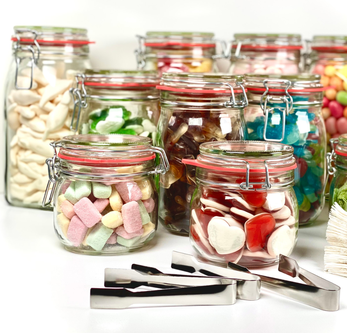 Die vier großen Bügelgläser sind gefüllt mit weißen Mäusen, Fruchtkrachen, sauren Zungen und Pinky Hearts. Der Inhalt der vier Midi-Gläser besteht aus einer guten Anzahl an Schlümpfen, Happy Cola, Fröschen und Apfelringen. Und zu guter Letzt haben wir dann noch 3 kleiner Bügelgläser. Die sind reichlich gefüllt mit Liebesherzen, Pasta Basta (Drachenzungen) und Ahoi Brause Kaubonbons. Die Drachenzungen und die Ahoi Brause Kaubonbons sind sogar vegan!