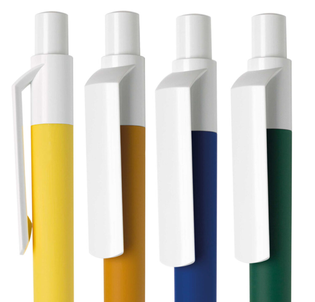 Druckkugelschreiber mit haptisch angenehmer Softtouch Oberfläche auf dem Schaft, in klarem und dezentem Design und farbigem Drückerpunkt.